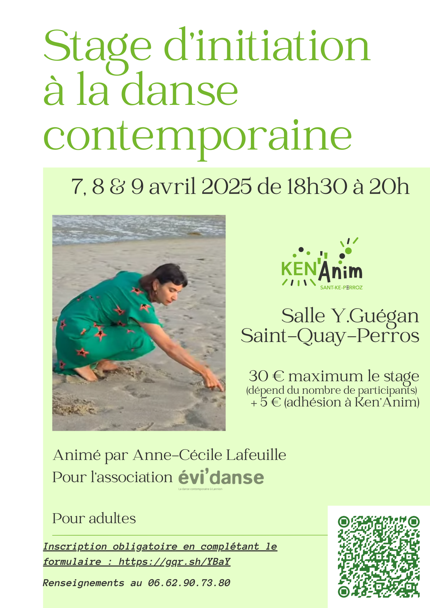 KEN’Anim vous propose un stage d’initiation à la danse contemporaine pour adultes (à partir de 12 ans). Il se déroulera les 7, 8 et 9 avril de 18h30 à 20h à la salle Y. Guégan et sera animé par Anne-Cécile Lafeuille, éducatrice sportive en danse.