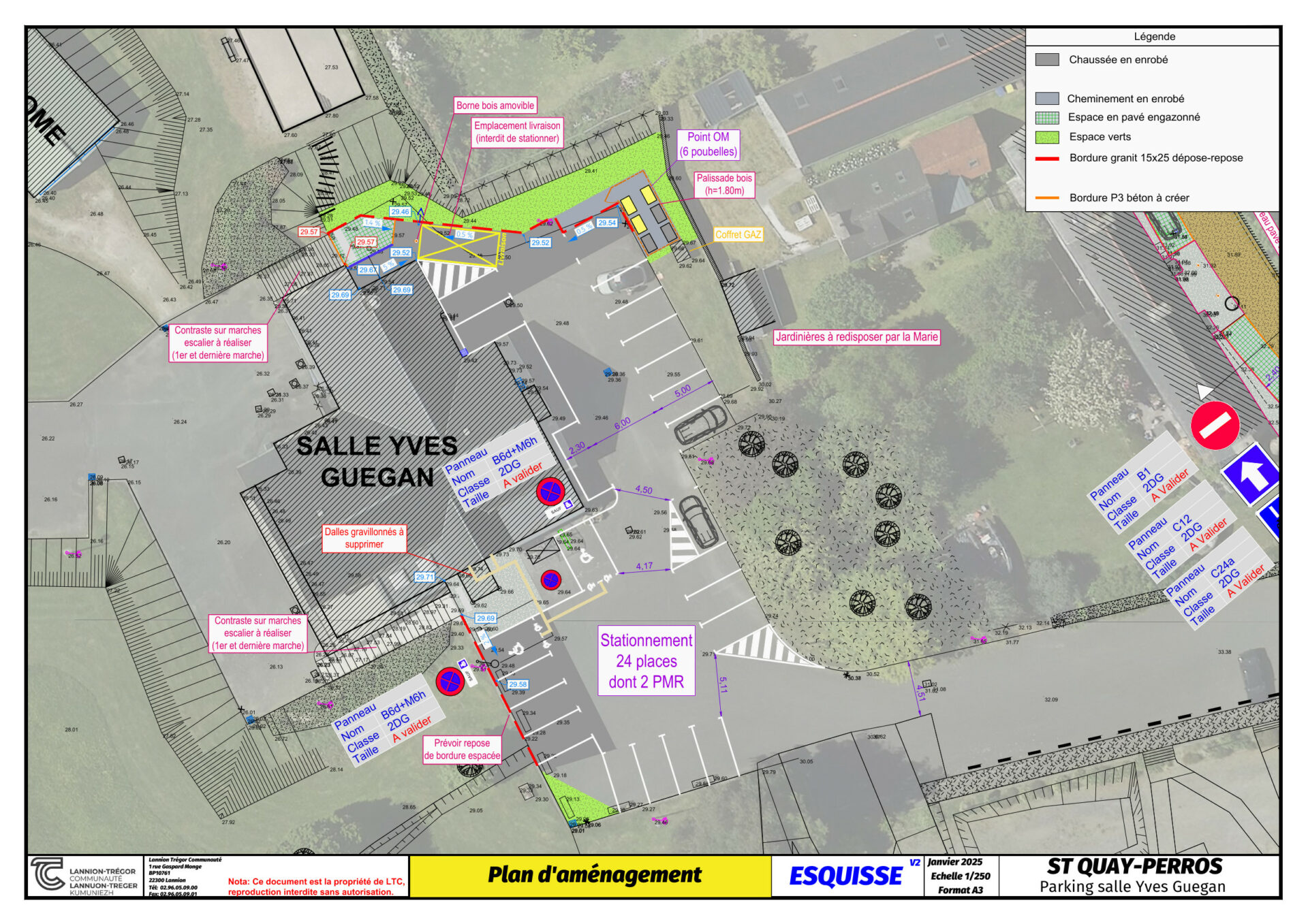 Afin d’optimiser le stationnement autour de la salle Yves Guégan, la commune a missionné le bureau d’étude Voirie (BE-VRD) de LTC. Les contraintes étant l’accès à la salle Monique Legrand pour des livraisons et traiteurs, 2 places PMR réglementaires (dévers, taille et bande de guidage), un local poubelle éloigné de la salle (obligation dictée par la commission sécurité du SDIS), et l’accès PMR par la porte principale.